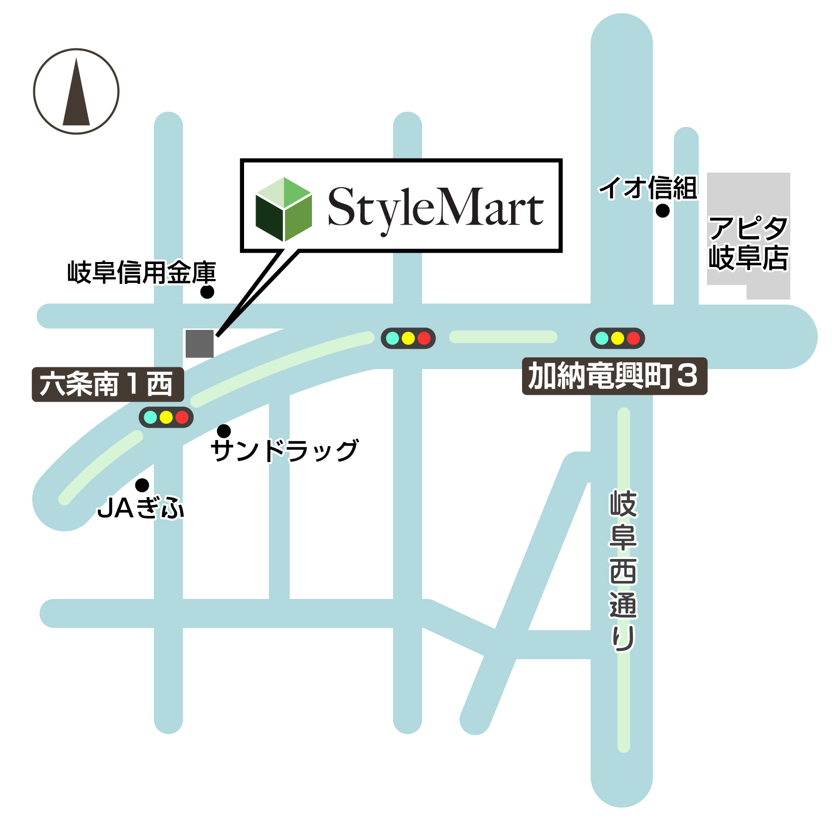 各務原方面から来られる方はアピタ岐阜を通り過ぎて真っ直ぐ行くとスタイルマートにたどり着きます。